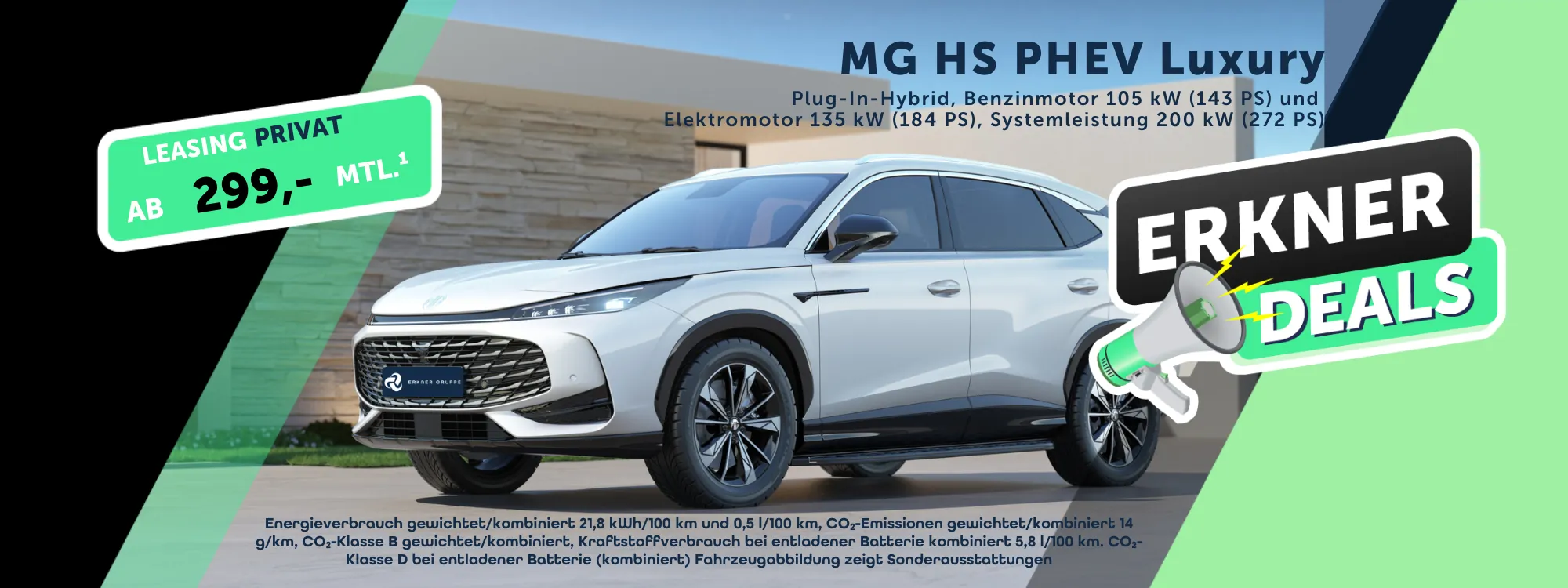 1 Ein unverbindliches Privat-Leasingangebot (Kilometerleasing) der ARVAL Deutschland GmbH (Leasinggeber), Bajuwarenring 5, 82041 Oberhaching, für das Fahrzeug MG HS PHEV Luxury, Anschaffungspreis 41.990,- €*, zzgl. 1.290,- € Überführungskosten, 0€ Sonderzahlung, 299,-€ mtl. Leasingrate, 60 Leasingraten, 5.000 km Laufleistung pro Jahr, 19.230,-€ Gesamtbetrag aller Raten & Sonderzahlungen. Zulassungskosten in Höhe von 190,-€ berechnet der ausliefernde Betrieb separat. Bonität vorausgesetzt. Alle Preise verstehen sich zzgl. MwSt. Das Leasingangebot gilt nur für Privatkunden.